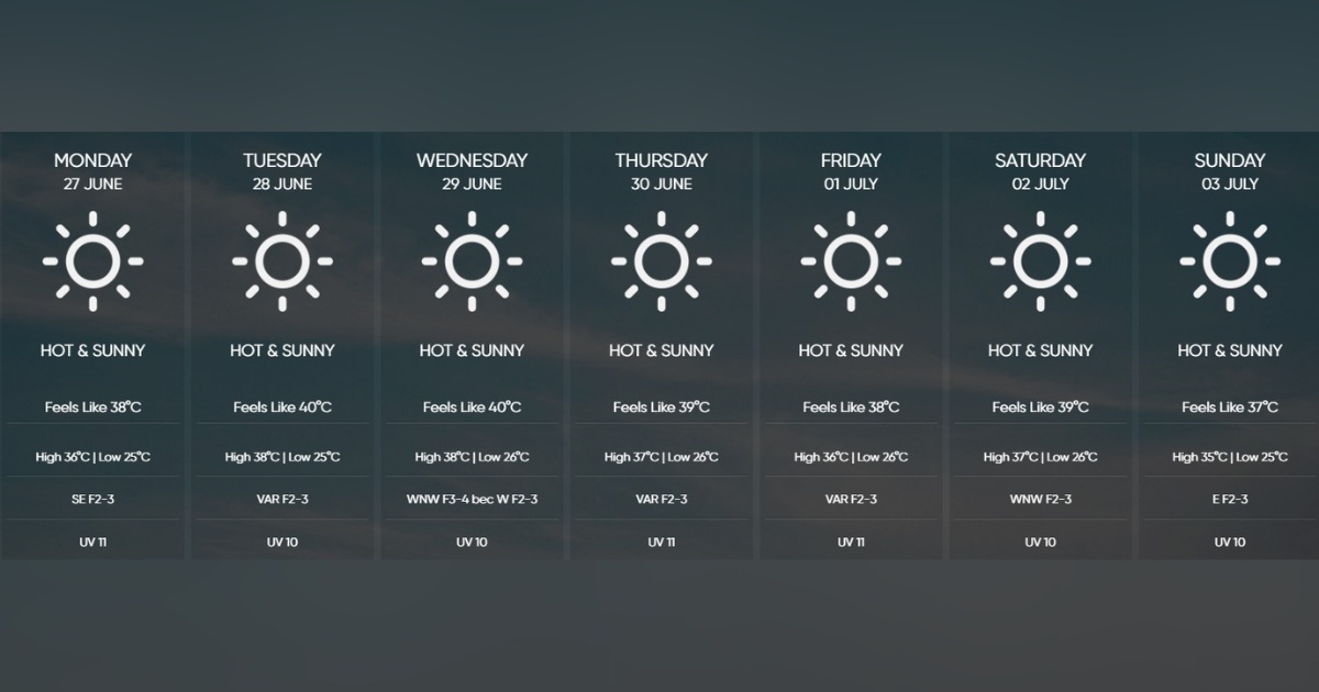 Like It-Temp Madwarna, MIA is expecting the week’s temperatures to reach their climax on Tuesday 28th and Wednesday 29th, forecasting highs of 38°C which will “feel like 40°C”.